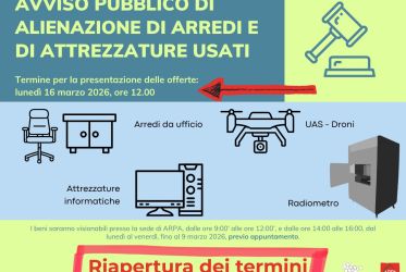 Sono stati riaperti i termini fino al 16 marzo 2026 per partecipare all'asta pubblica per la vendita di arredi e attrezzature di proprietà dell'Agenzia, attualmente non più in uso e distinti per lotti merceologici omogeni.