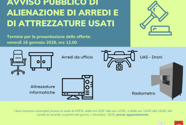 Gli arredi e le attrezzature saranno visionabili presso la sede di ARPA, dalle ore 9:00 alle ore 12:00, e dalle ore 14:00 alle 16:00, dal lunedì al venerdì, a partire dal giorno 1 dicembre e fino al giorno 9 gennaio 2026 (previo appuntamento).