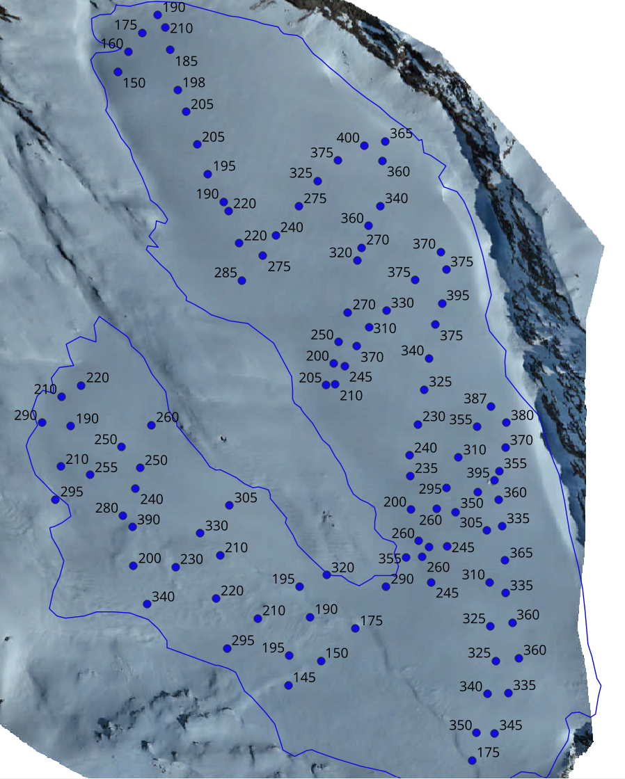Distribuzione spaziale dei punti di misura del manto nevoso sul Ghiacciaio del Timorion. In blu il perimetro del ghiacciaio (ortomosaico derivato da rilievo fotogrammetrico del 19 maggio 2025).